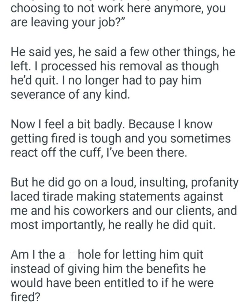 Now the boss is feeling a little guilty. He knows getting fired is tough and that people react emotionally in the moment. He is wondering if he should have saved the guy from himself. But let us look at the behavior here. This wasn’t a polite resignation. This was a “loud, insulting, profanity-laced tirade” against the boss, the coworkers, and the clients.
