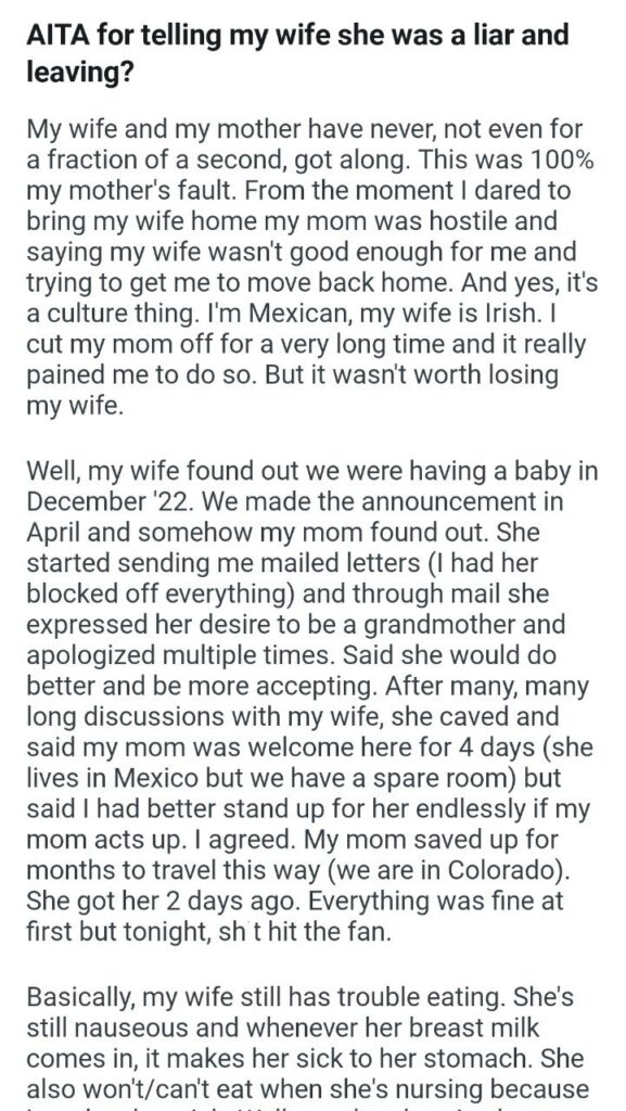 He admits his mom was “hostile” from day one, telling him his wife (who is Irish) “wasn’t good enough” for him (he’s Mexican). He admits it’s a “culture thing.” He did the right thing and cut his mom off for a “very long time” because it “wasn’t worth losing my wife.” This man has a history of knowing his mother is the villain.