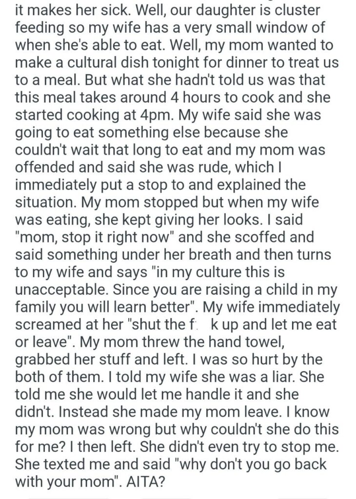 So, after “many, many long discussions,” his wife… the “saint” in this story… caved. She agreed to let her known abuser, the woman who hates her for her race, come stay in her home. For four days. But she gave him one, single, non-negotiable condition: “I had better stand up for her endlessly if my mom acts up.” And he agreed.