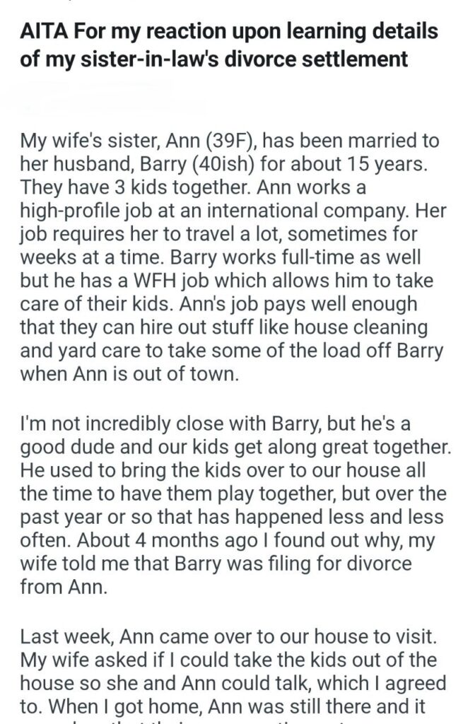 The narrator, who is married to Ann’s sister, noticed that Barry and the kids stopped coming around as much over the past year. About four months ago, he found out why: Barry had filed for divorce.