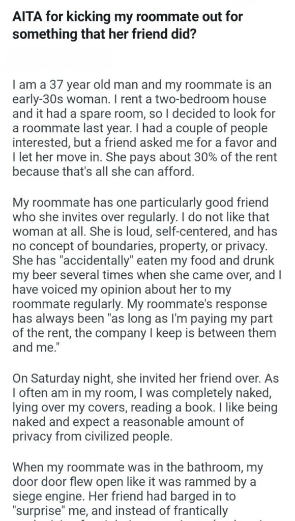 Things went from annoying to absolutely violating on a Saturday night. The roommate had her toxic bestie over. The OP was doing what any person should be allowed to do in the privacy of their own bedroom: chilling out completely naked while reading a book. He was minding his own business, expecting the basic human decency of a closed door.