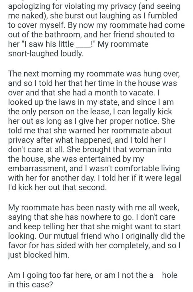 That snort-laugh was the sound of her cheap rent evaporating. The sheer disrespect of that moment is staggering. Not only was his privacy invaded in the most humiliating way possible, but he was then bodyshamed in his own home by a guest, and his roommate thought it was hilarious.