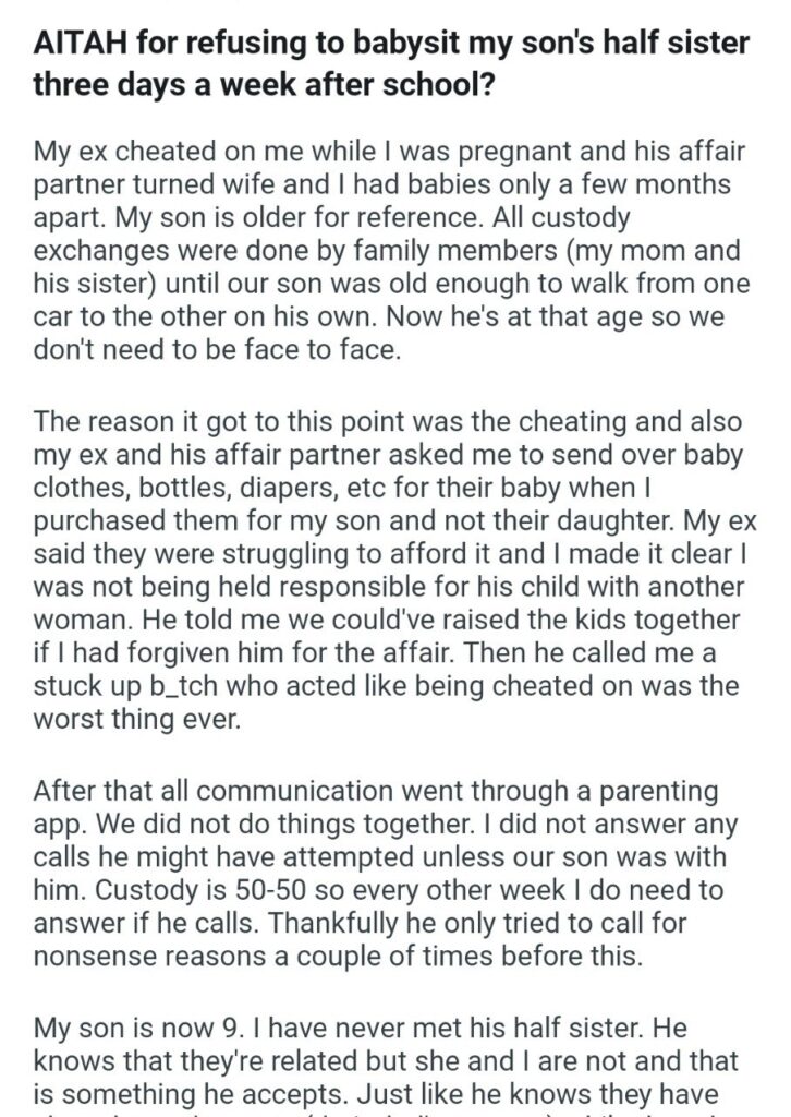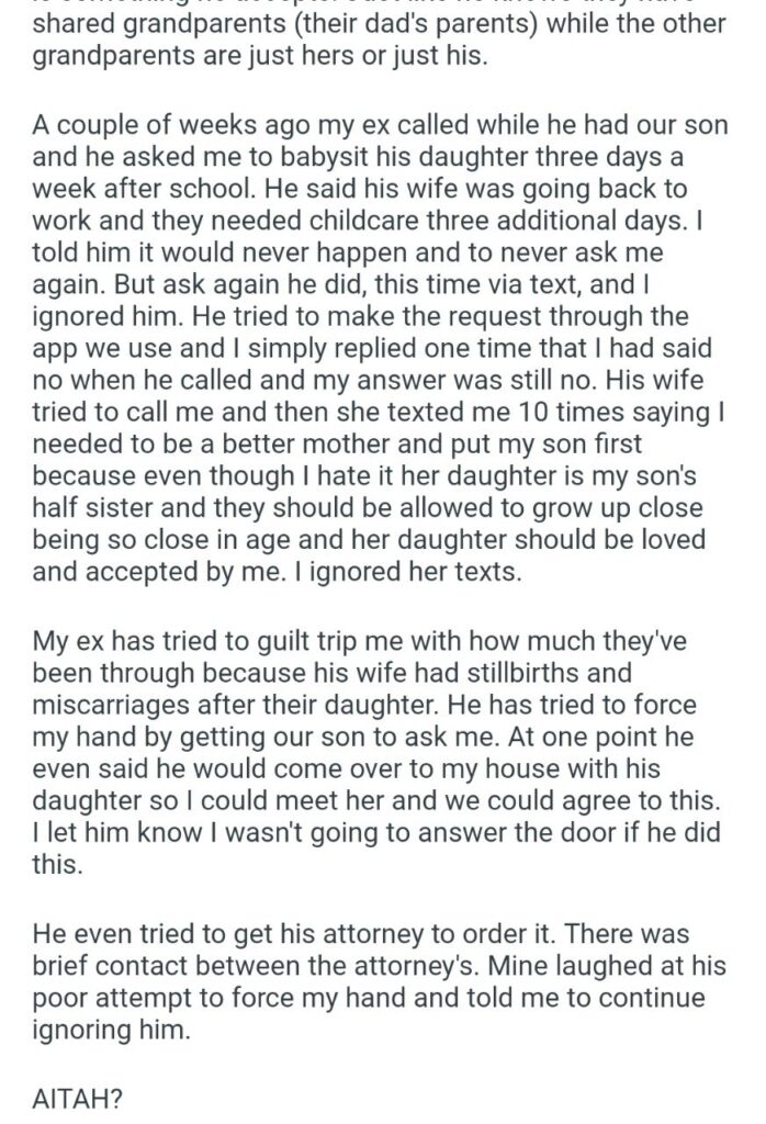 The narrator obviously said no. She said it would “never happen.” But these two do not understand the word no. The new wife started blowing up her phone with texts accusing her of needing to be a “better mother.” She claimed the narrator should “love and accept” her daughter because they are half-siblings. While it is true the kids are related that does not mean the betrayed ex-wife is obligated to provide free childcare for the symbol of her marriage’s destruction.