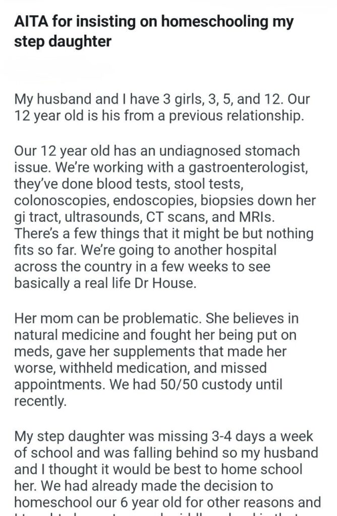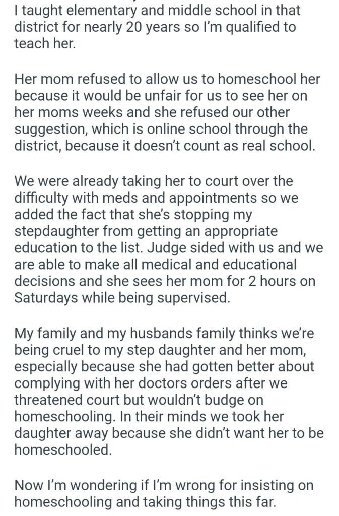 Is the stepmom the ahole? Absolutely not. N-T-A. You didn’t take a child away because of homeschooling. You saved a sick child from a mother who was medically neglecting her and sabotaging her education for her own ego. The judge doesn’t give supervised visitation for no reason. You did the hard thing, but it was the right thing.