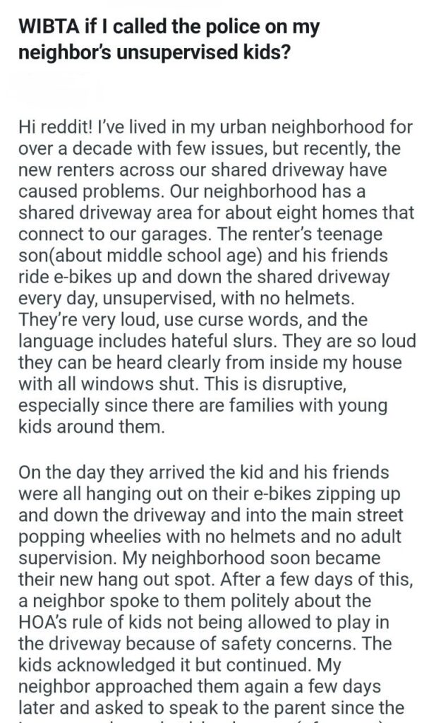 So now, our narrator is considering calling the police. And her reasons are solid gold: unsupervised kids, no helmets, e-bikes (a huge safety concern!), hateful slurs, and a complete lack of consequences. She knows the cops might only give tickets, but she’s hoping for a “reality check.”