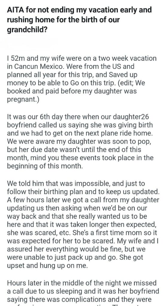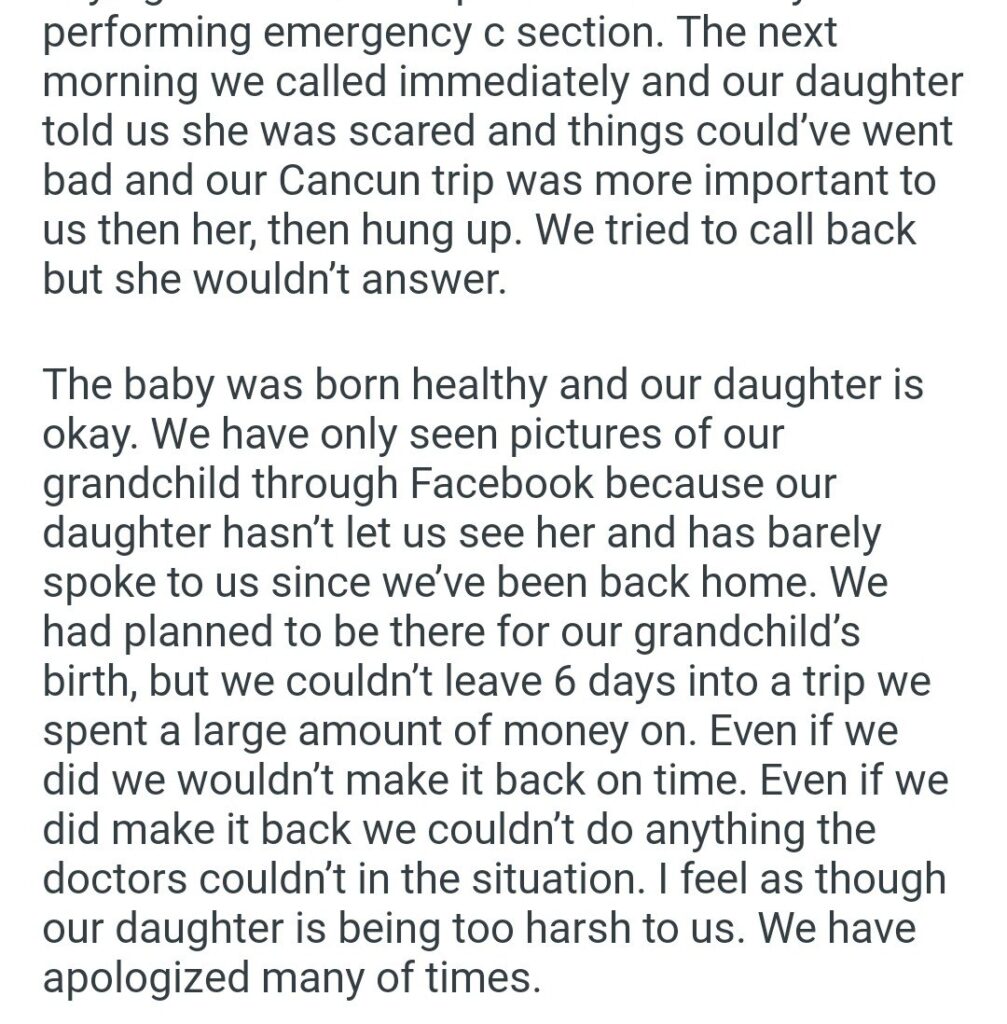 The next morning, they called back. And the daughter, who is now post-surgery and a new mom, is (justifiably) livid. She told them she was scared, “things could’ve went bad,” and that their “Cancun trip was more important to us then her.”