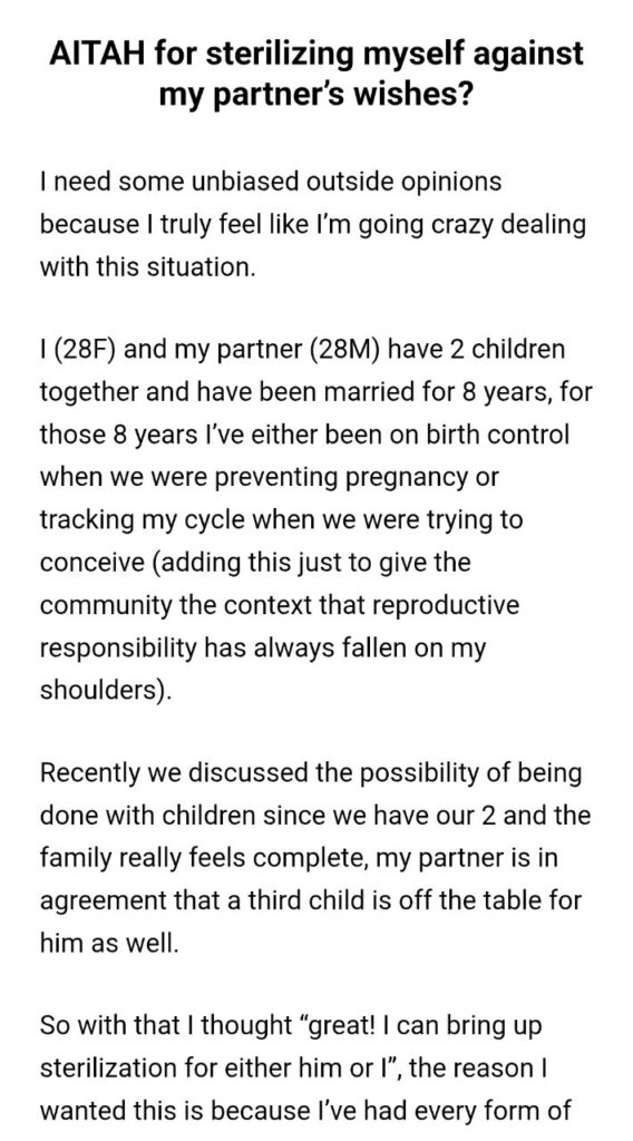 So, let’s set the scene. We have a 28-year-old woman who has been married to her partner for eight years. They have two wonderful kids, and they’ve mutually decided that their family is complete. Perfect, right? Sounds like a healthy, communicative partnership making responsible life decisions together. We love to see it.