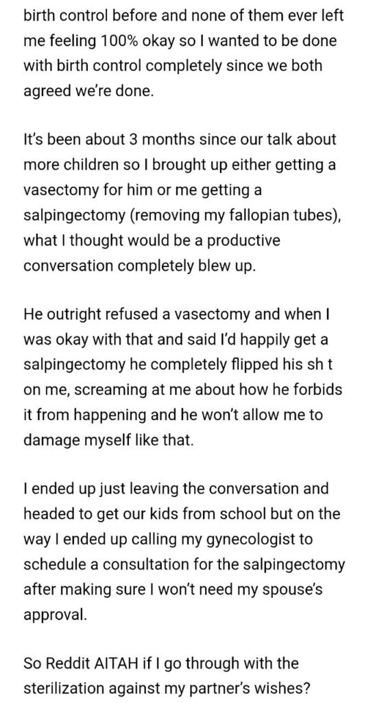 She’s asking if she’s the ahole for going through with it against his wishes. Let’s be crystal clear: N-T-A. Not the ahole. Not even a little bit. It is her body. Full stop. The conversation is over.