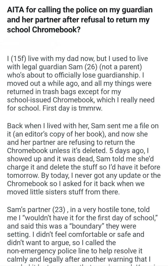 But Sam didn’t return everything. She held onto OP’s school Chromebook. With the first day of school looming the very next day, the situation went from annoying to critical. OP desperately needed the device to, you know, go to school. The reason Sam was holding it hostage? She had sent a file of her unfinished book manuscript to the laptop and refused to return the hardware until the file was deleted.