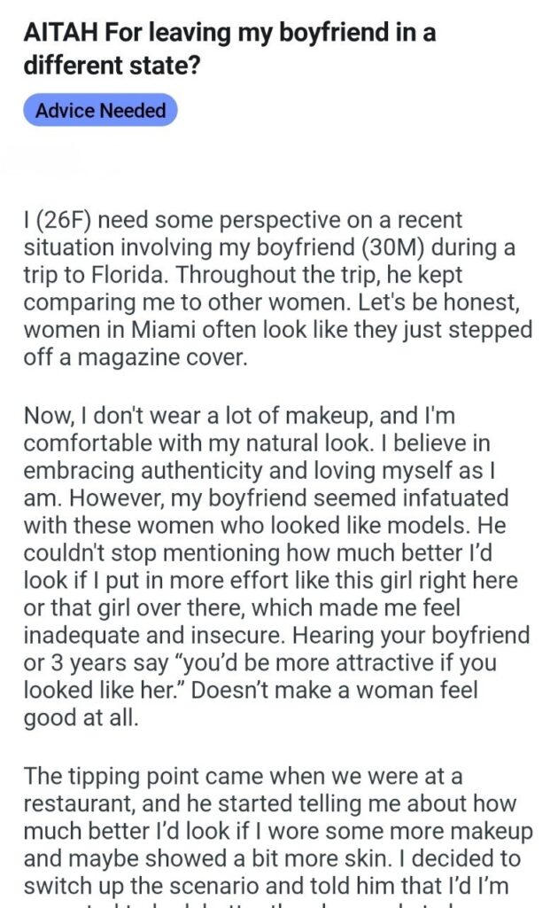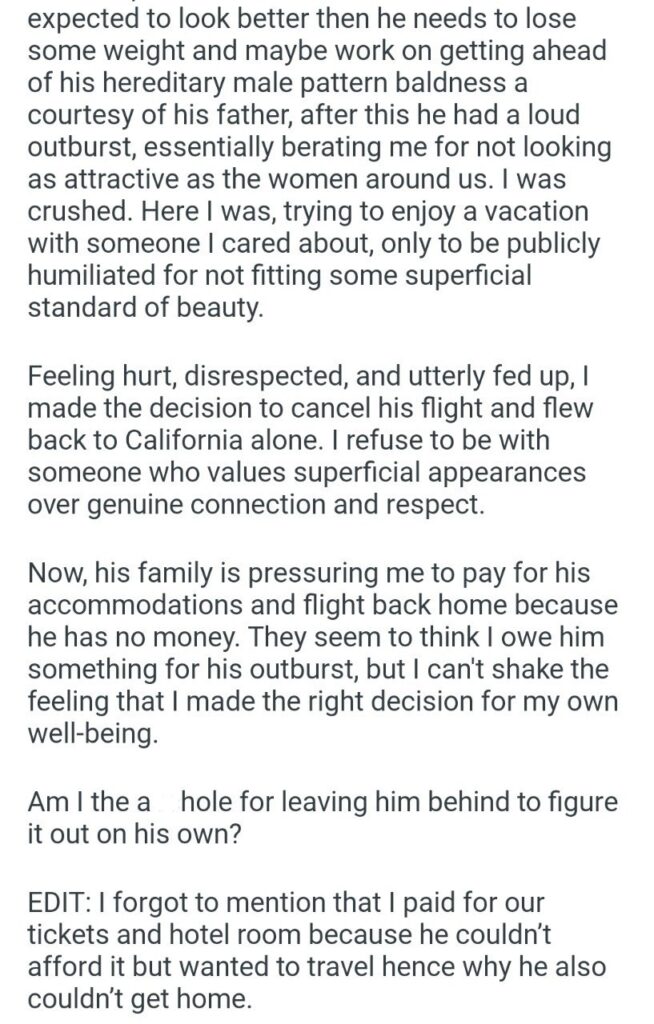 She, being a generous partner, paid for their entire trip. The tickets, the hotel, all of it, because he “couldn’t afford it but wanted to travel.” And how did this man repay her generosity? By spending the entire vacation telling her she was ugly.