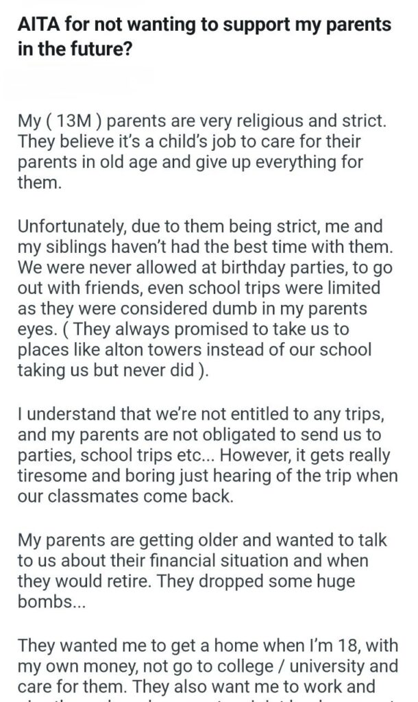 So, WIBTA if he didn’t support this? Is he the ahole? Absolutely not. He is not the ahole. He is a child in an abusive situation. He is not “conflicted”; he is being manipulated. His “duty” is not to fund his parents’ retirement. His “duty” is to be a 13-year-old kid, and their duty is to be his parents, not his future financial dependents.