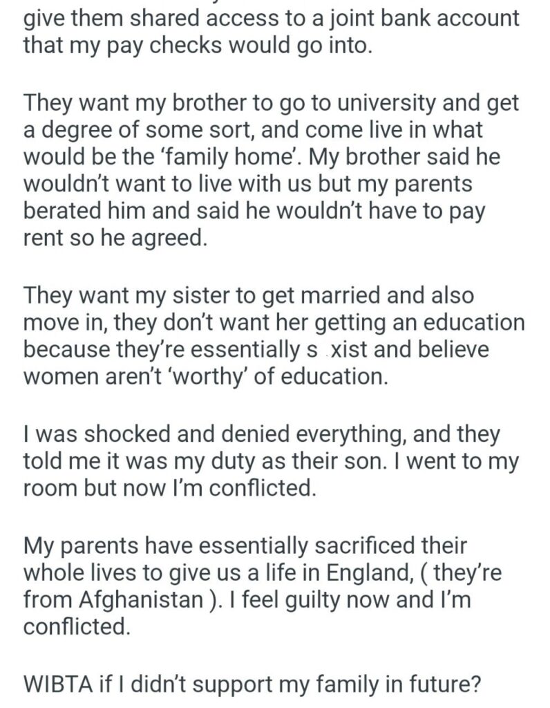 And the sister? Oh, the sister gets the worst deal of all. She is not allowed to get an education, because, in the narrator’s own words, “they’re essentially s*xist and believe women aren’t ‘worthy’ of education.” Her “plan” is to get married and also move into the house. They are literally building their own personal cult, funded by their youngest son.