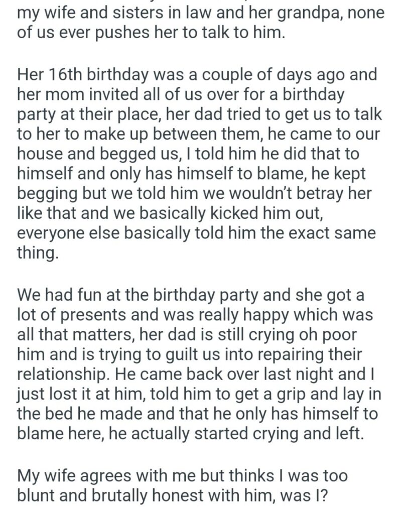 His daughter is not a tool for his redemption arc. He needs to face the consequences of his actions. “Blunt and brutally honest” is exactly what a delusional ahole like him needs to hear. He made his bed; now he gets to cry in it, alone. And good for everyone in that family for not enabling his bullsh!t.
