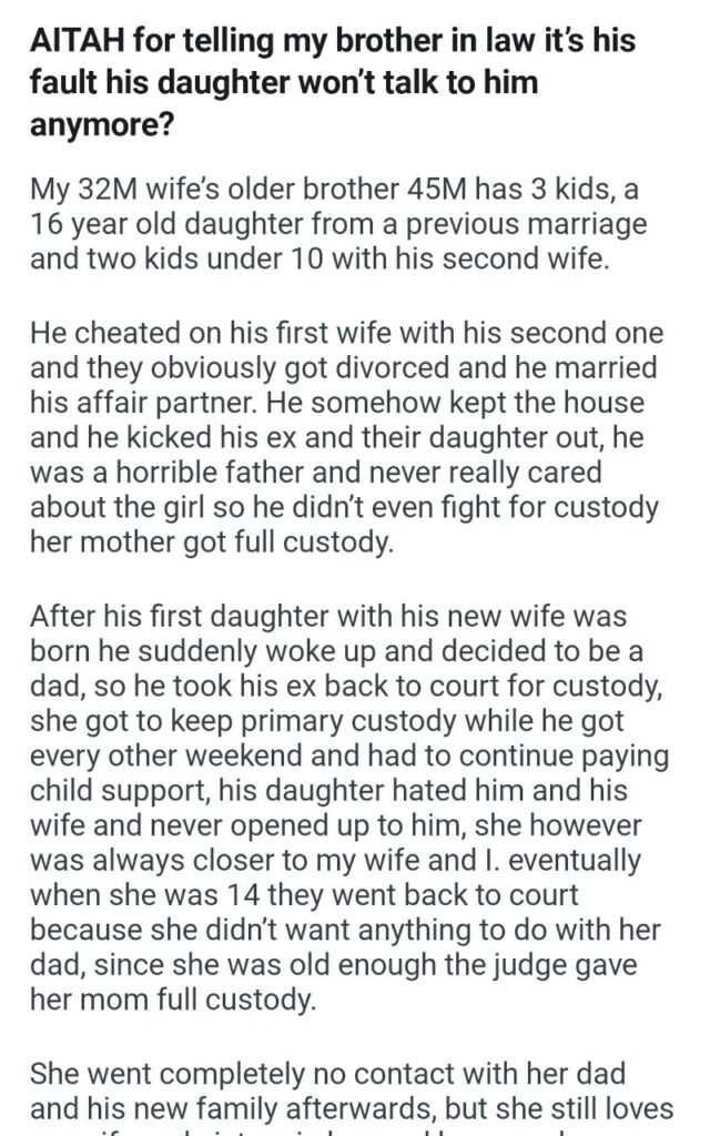 His now-teen daughter, understandably, “hated him and his wife and never opened up to him.” She was always close to our narrator and his wife, which is a key detail here. Eventually, when she was 14, they went back to court because she “didn’t want anything to do with her dad.” The judge, respecting her wishes, gave her mom full custody. Our hero’s niece went “completely no contact” with her dad and his new family.