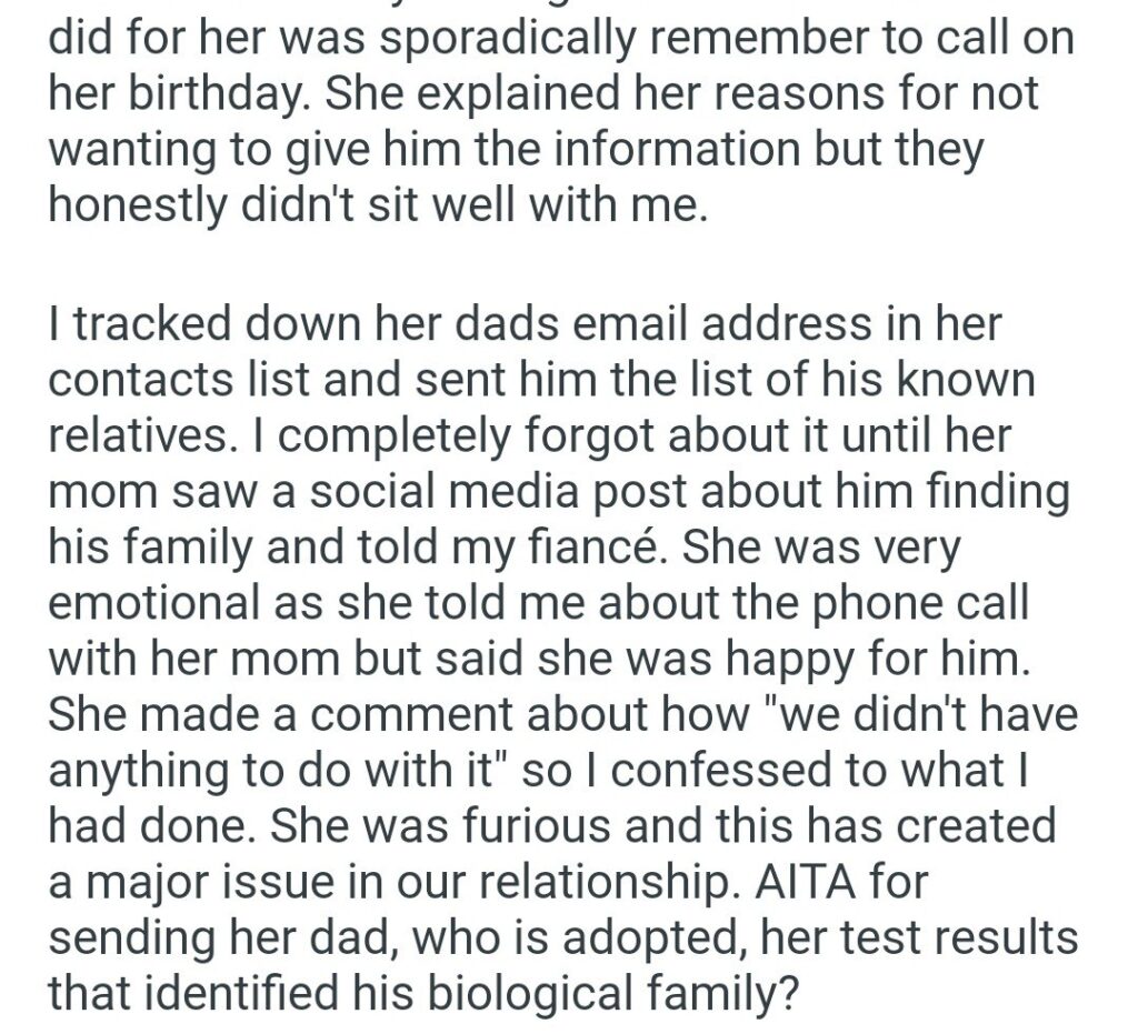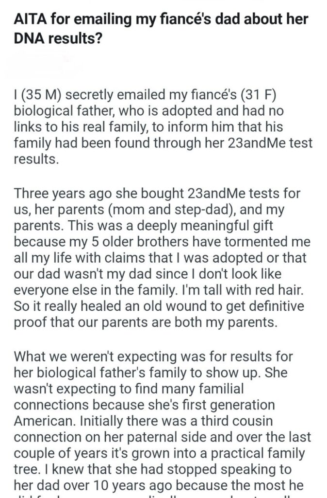 This is where a good partner supports their significant other’s boundaries. But our narrator didn’t do that. He decided that her reasons for protecting her peace “didn’t sit well” with him. Because he had a happy ending with his DNA test, he felt entitled to force one on her. He went into her contacts list, stole her estranged father’s email address, and sent him the list of relatives she had found. He gave away her private genetic research to a man she actively chose to cut out of her life.
