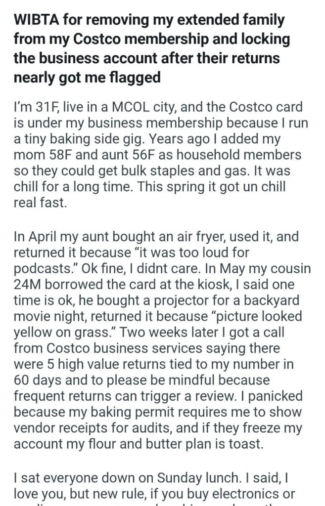 So is she the ahole? Absolutely not. N-T-A. You do not get to jeopardize someone’s business license because you are too lazy to measure a wall before buying a television. Her family is treating Costco like a library and her career like a joke. Lock that account down, change the membership number, and let them pay full price for their gas until they learn some respect.