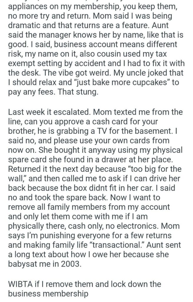 So she did the responsible thing and called a family meeting over Sunday lunch. She laid down a new rule: if you buy electronics or appliances on her membership, you keep them. No more rent-and-return schemes. And how did her family react to this very reasonable boundary? They gaslit her. Her mom called her “dramatic.” Her aunt bragged that the manager knows her by name, which is definitely not a flex in this context.