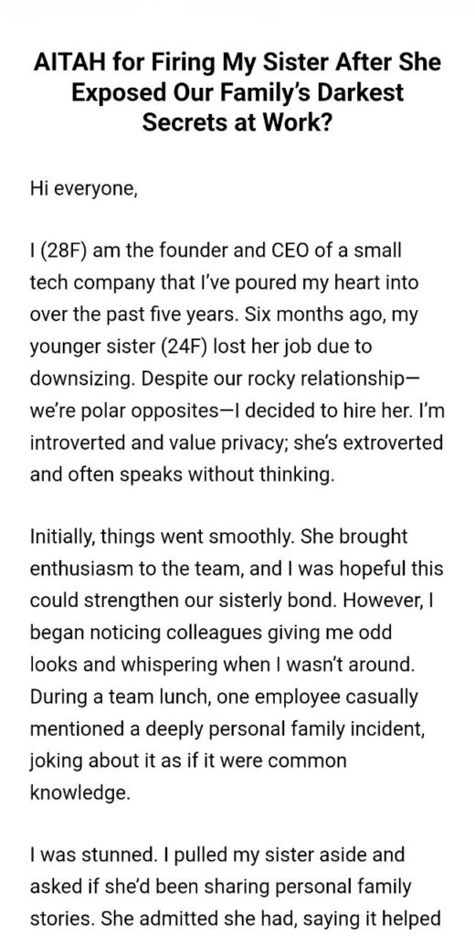 Hiring family is, at the best of times, a gamble. It’s a minefield of blurred lines, unspoken expectations, and holiday-ruining potential. One 28-year-old CEO just learned this lesson in the most horrifying way possible after she hired her younger sister, who then proceeded to turn the tech company’s water cooler into her own personal trauma-dumping podcast.