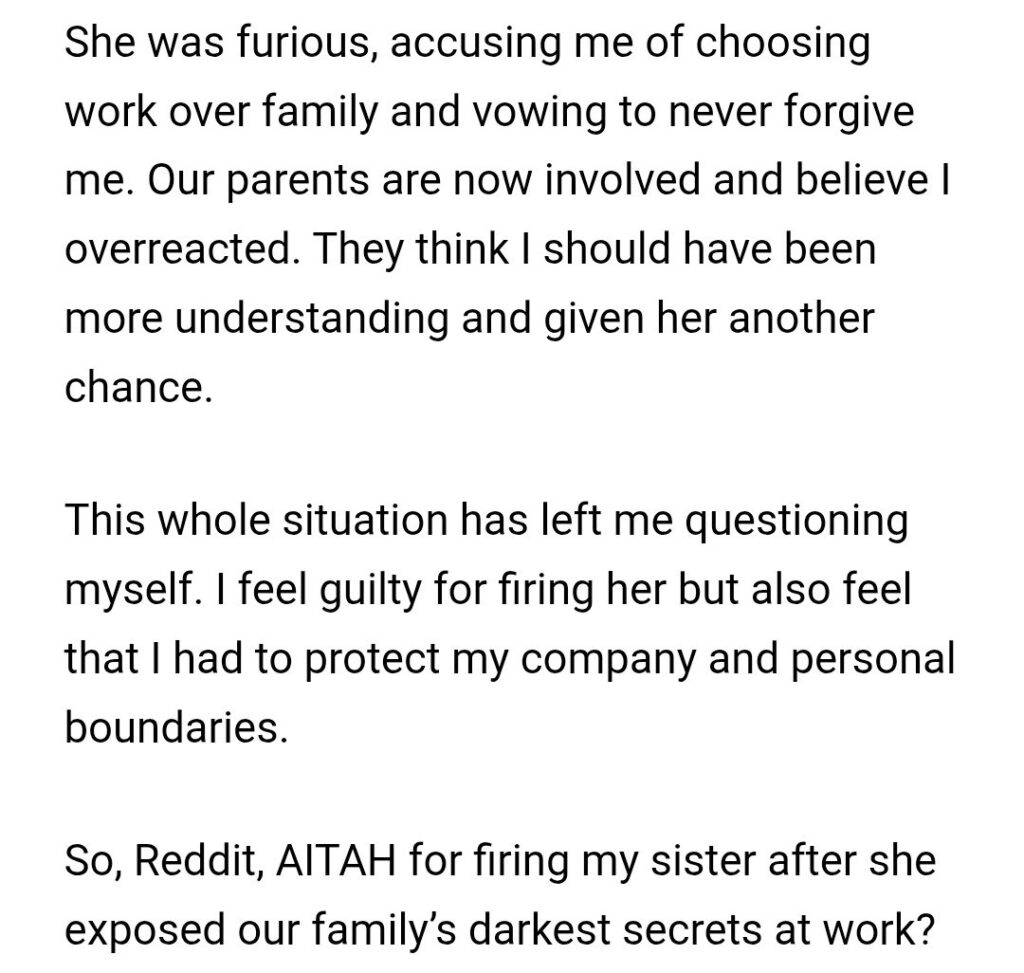 And the fallout? The sister is “furious,” vowing to “never forgive” her. And the parents—the very people whose trauma is being spilled—think the CEO “overreacted” and should have given her another chance.