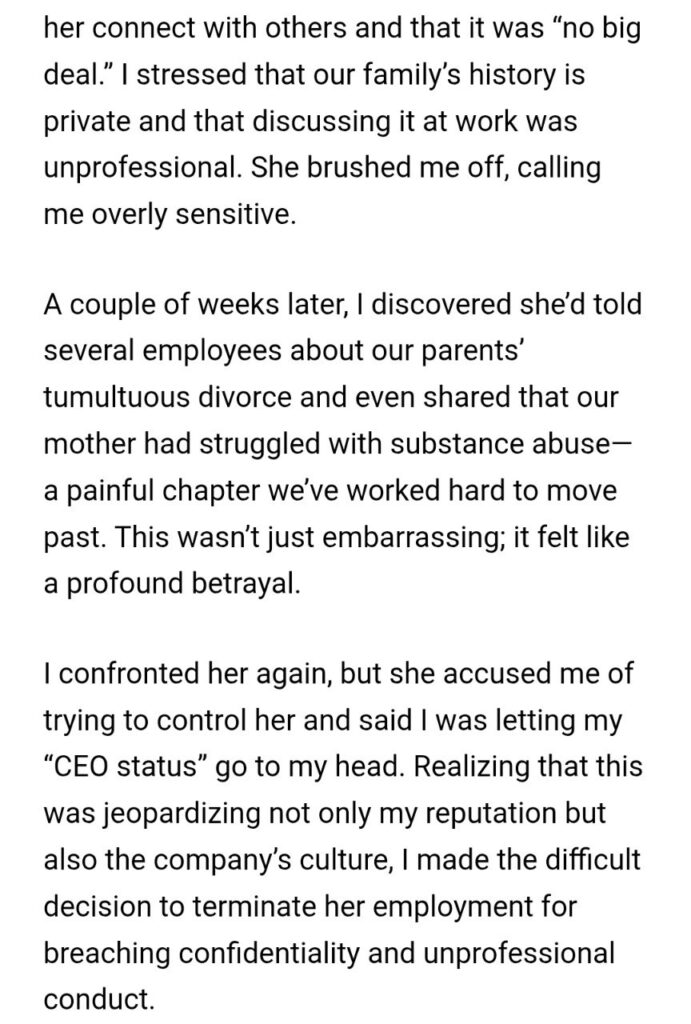 This wasn’t just “connecting.” This is a human wrecking ball of gossip. But it gets so, so much worse. A few weeks later, the CEO discovered her sister hadn’t just overshared; she had gone nuclear. She had told several employees about their parents’ “tumultuous divorce” and even shared that their mother had “struggled with substance abuse.”