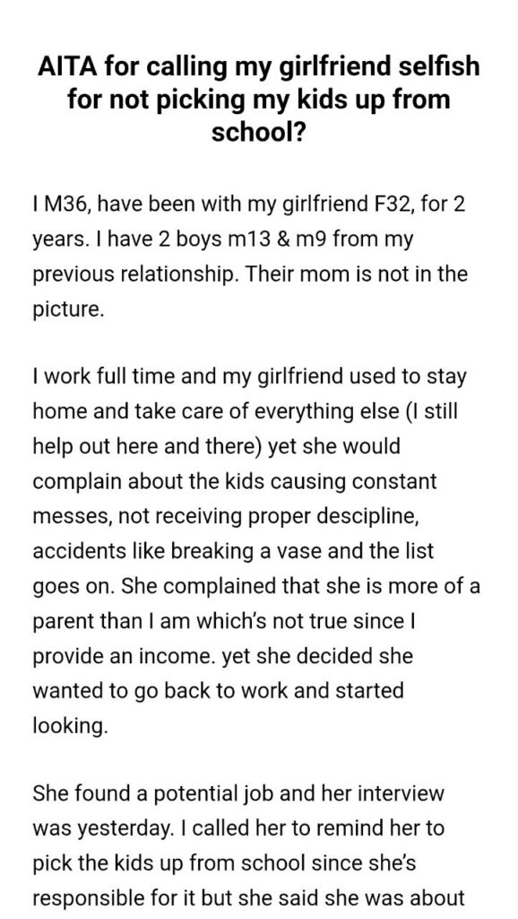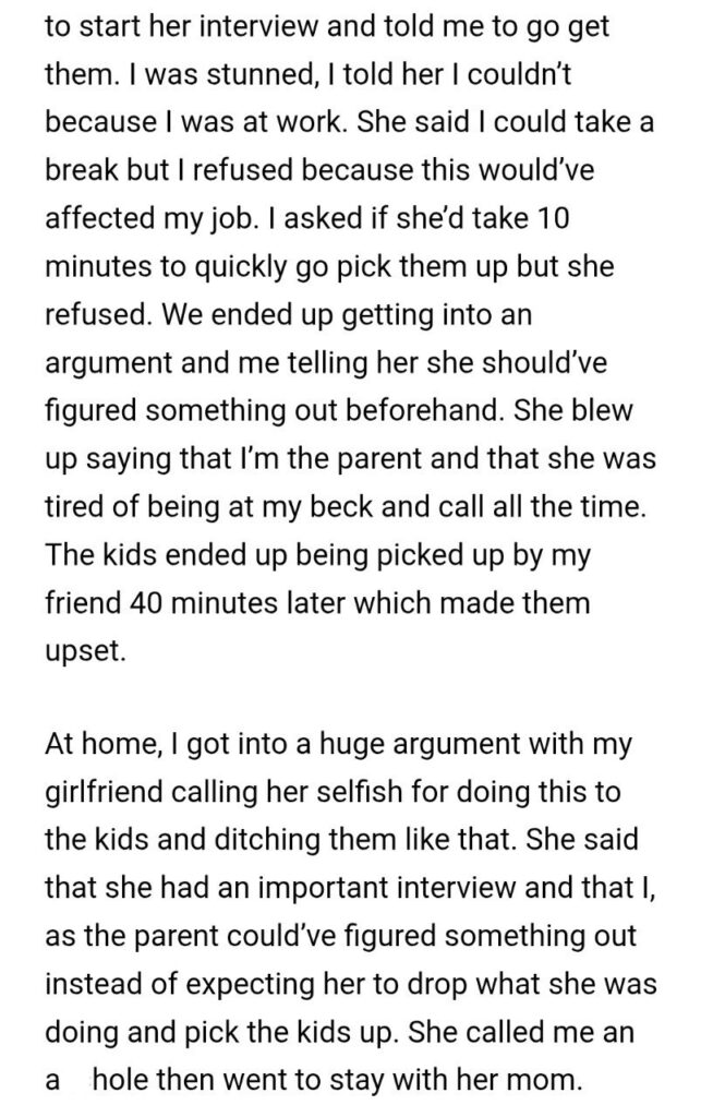 The girlfriend, showing a shiny spine, refused. She told him she was tired of being at his beck and call. The kids ended up being picked up late by a friend, which is unfortunate for them, but entirely their father’s fault. He knew she had an interview. He just assumed her life was less important than his convenience.