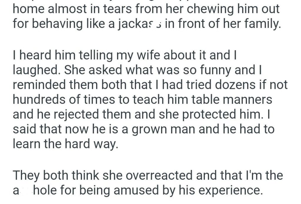 This is where the dad becomes the main character. He heard the story and he just laughed. He didn’t comfort him. He didn’t offer a tissue. He laughed the laugh of a man who has been predicting this exact car crash for years. When his wife asked what was so funny, he laid it out perfectly. He tried hundreds of times to teach him manners. She blocked him. Now, the world taught him the hard way.