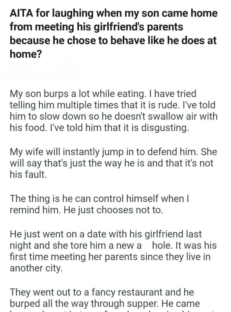 When I started reading this, I was under the impression the narrator was speaking of a young child. That is until the mention of meeting the girlfriend’s parents. Unless a gastrointestinal issue is causing the burping, there is no reasonable excuse to expel excess air at the dinner table. The girlfriend reacted as expected. I really want to know how old the offender is. The son had to find out the hard way. Narrator is NTA.