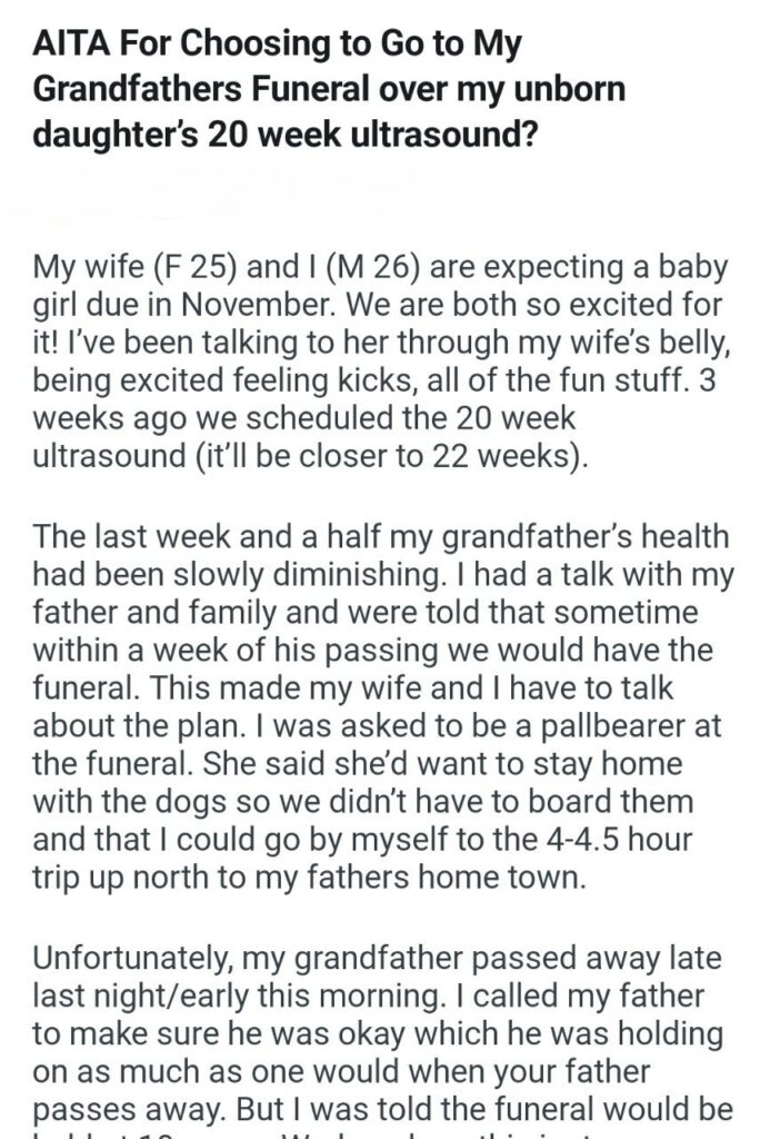 Life has a really nasty habit of throwing everything at you all at once. Just when you are celebrating a new beginning, you are forced to say a final goodbye. It is the circle of life, sure, but it is also incredibly stressful. One expectant father on Reddit found himself caught in the ultimate emotional crossfire when the universe decided to schedule his grandfather’s funeral at the exact same time as his unborn daughter’s anatomy scan.