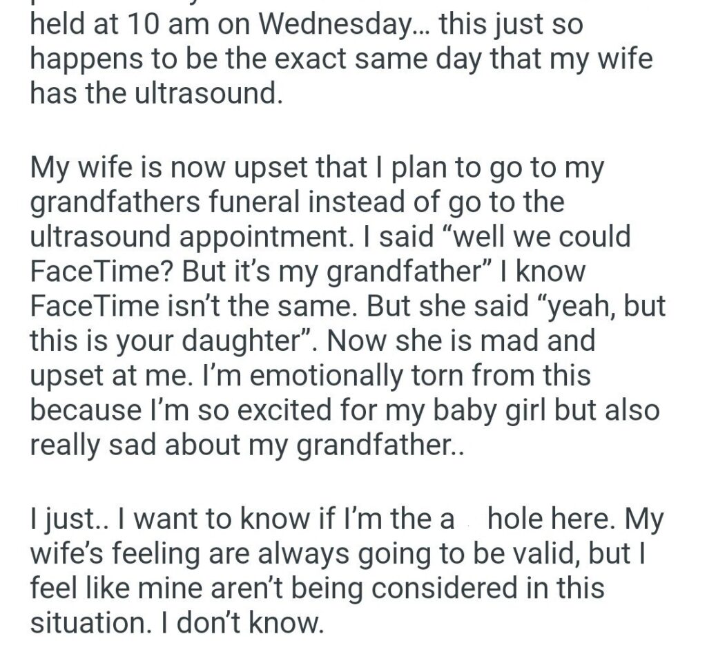 So, is he the ahole? Absolutely not. N-T-A. The wife needs to take a serious step back and realize that the world does not stop spinning just because she is pregnant. Her husband deserves the space to say goodbye to his family. The baby will still be there when he gets back. His grandfather won’t.