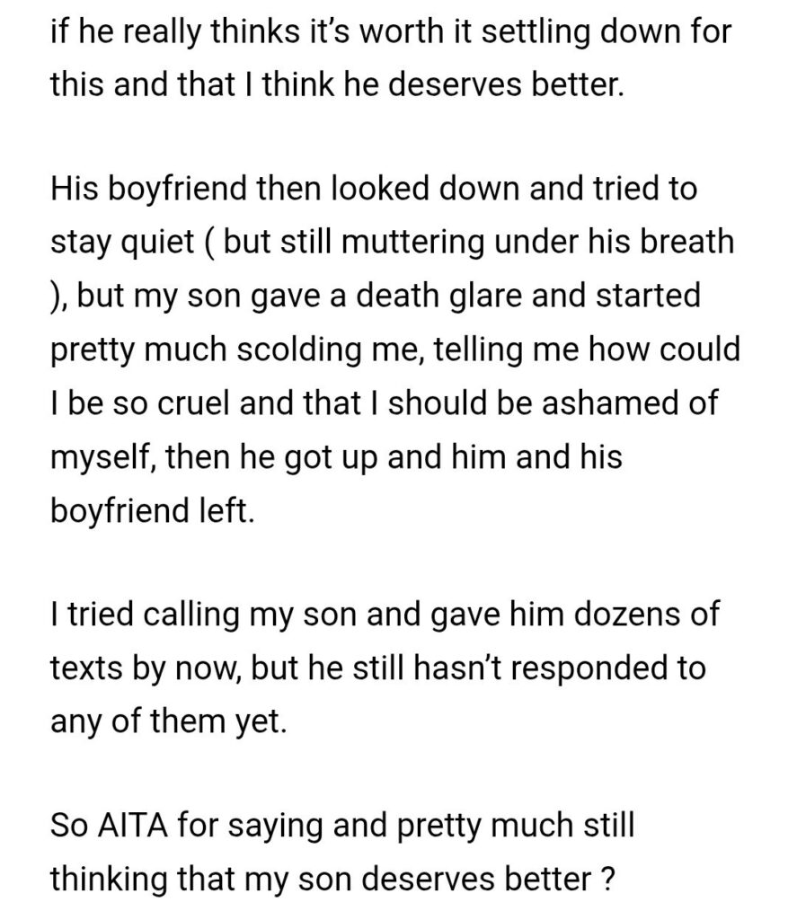 So, is he the ahole? Yes. A thousand times, yes. You are the ahole. That wasn’t “tough love” or parental concern. That was ableism wrapped in a thin veneer of “protectiveness.” You didn’t protect your son; you humiliated the person he cares about. Don’t expect a text back anytime soon.