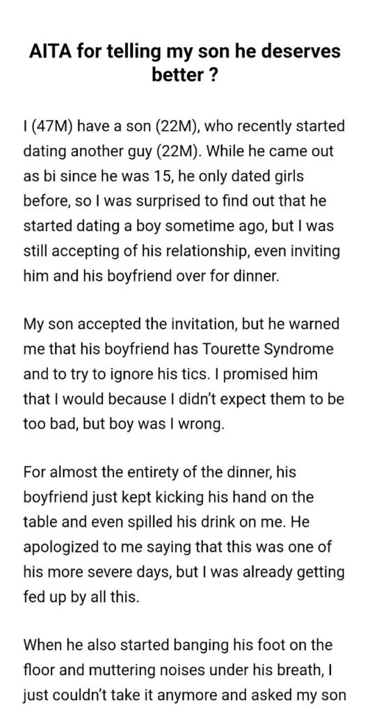 Our narrator is a 47-year-old dad with a 22-year-old son. The son recently started dating a guy, having previously dated girls. Dad says he was “accepting” and invited them to dinner. So far, so good. But here is the crucial detail: the son gave his dad a heads-up. He explicitly warned him that his boyfriend has Tourette Syndrome and asked him to please just ignore the tics.