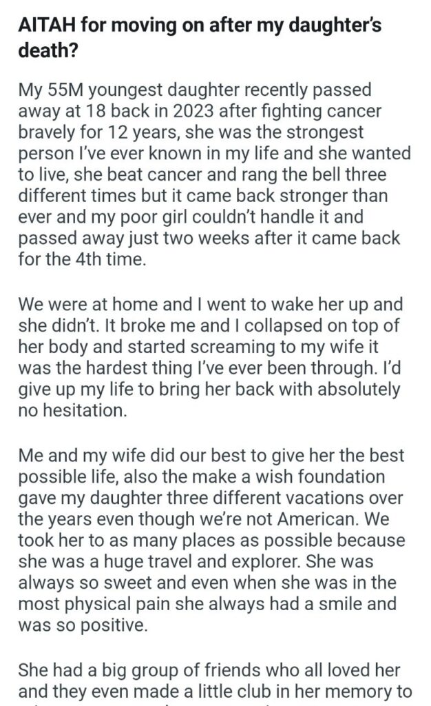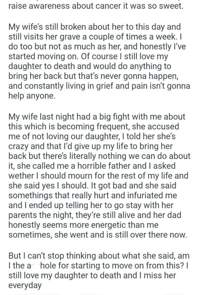 There are no aholes here. There are just two people who are broken in different ways. They don’t need Reddit’s judgment. They need a grief counselor, and they need to find a way back to each other, not as two people grieving differently, but as two people who loved their daughter more than anything in the world.