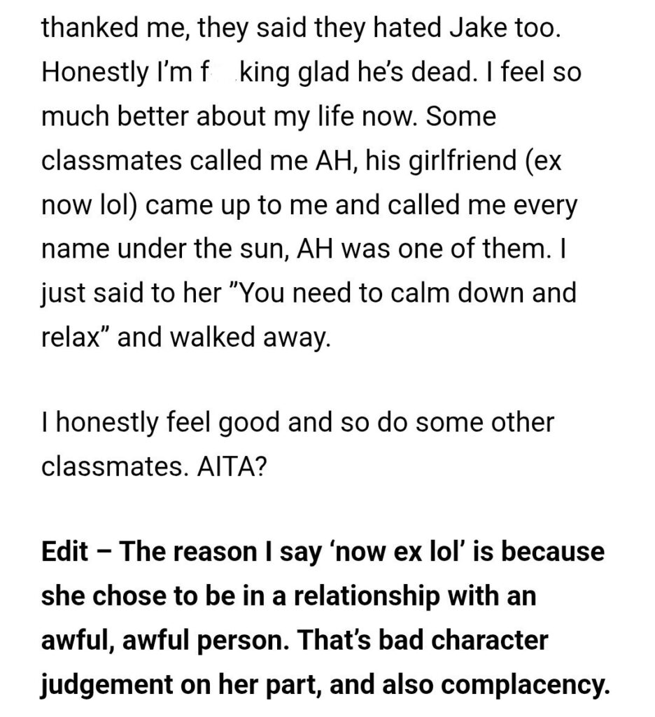 Of course, not everyone agreed. Jake’s girlfriend—who the narrator savagely refers to as his “ex now lol”—confronted him, calling him every name under the sun. His response to a grieving teenage girl? “You need to calm down and relax.” Okay, ouch. That is ice cold. He even doubles down, judging her character for dating a bully in the first place.
