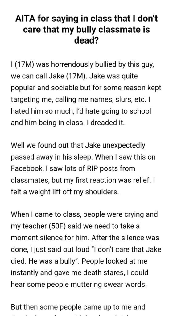 The next day, the atmosphere at school was heavy. Kids were crying. The teacher, a 50-year-old woman trying to manage a grieving classroom, called for a moment of silence. Our narrator sat through it. But the second the silence broke, he decided he was done pretending. He said, out loud, for everyone to hear: “I don’t care that Jake died. He was a bully.”