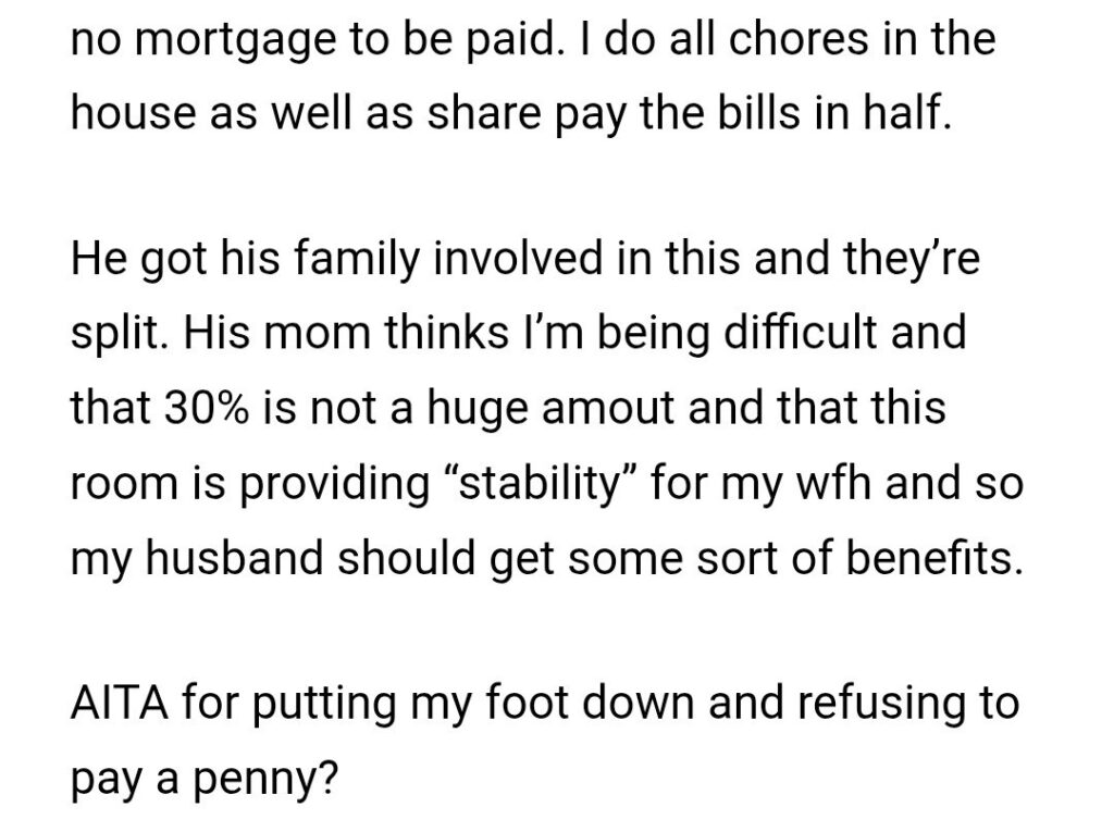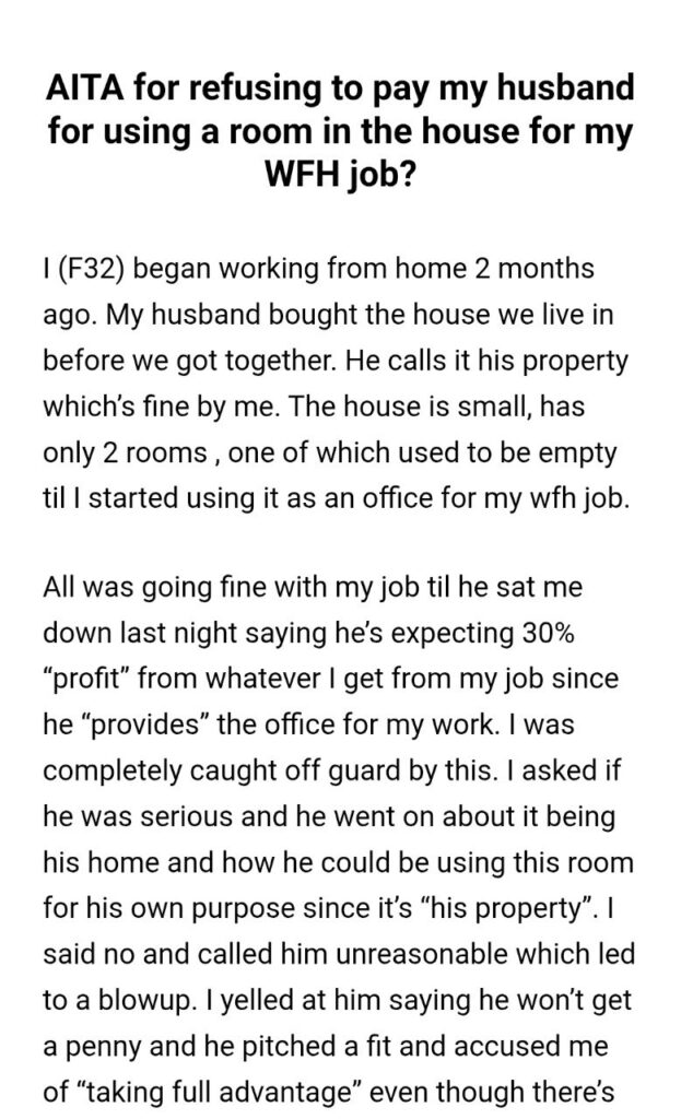 I need you to really sit with the insanity of this request. He owns the house outright, so there is no mortgage to pay. She is already paying half the bills. She is doing all the household chores. And now he wants to tax her income like he is the IRS. He claims he “could be using this room for his own purpose,” but let’s be real. The room was empty. He wasn’t using it. He just saw her making money and decided he deserved a finder’s fee.
