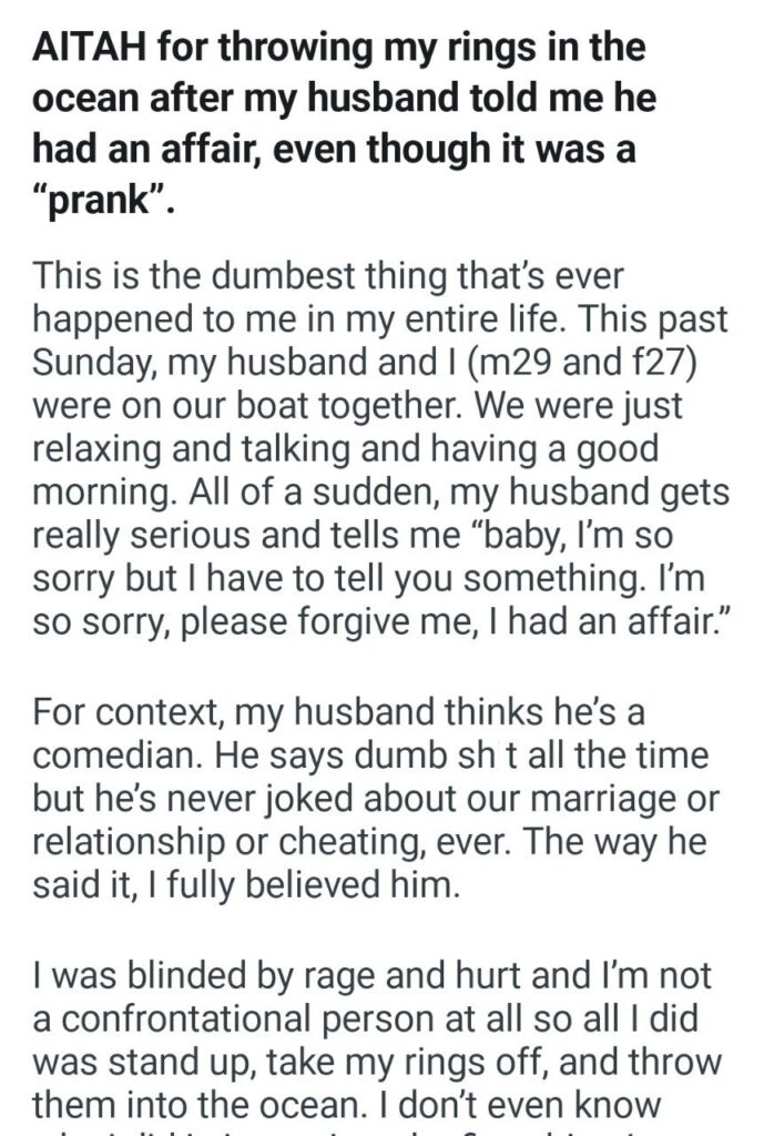 Let us pause right there. This is not a whoopee cushion. This is not a fake spider in the bed. This is a confession of betrayal delivered with Oscar-worthy acting. The wife notes that while he says dumb sh!t all the time, he has never, ever joked about their marriage or cheating. She had zero reason to doubt him. In her mind, her marriage just ended right there on the deck of that boat.