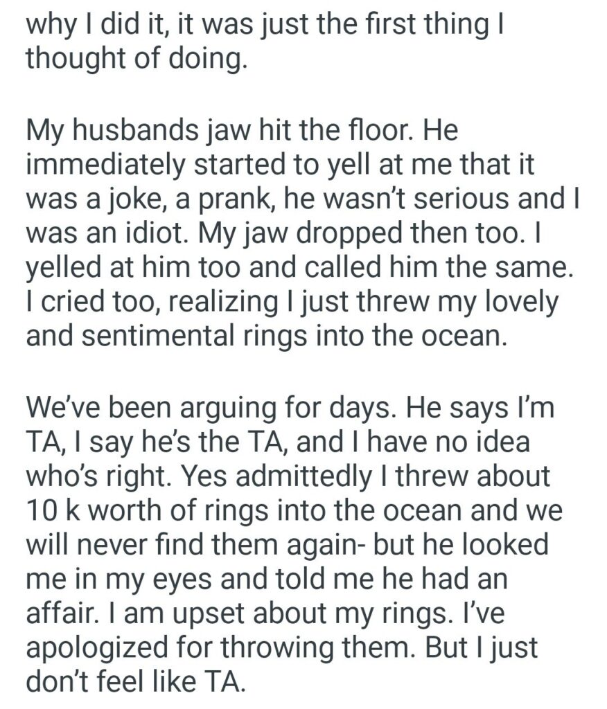 He is now furious about the money. He says she is the ahole for throwing ten grand into the water. And sure, $10,000 is a lot of money. It is a painful loss. But you know what else is expensive? The therapy she is going to need to get over the fact that her husband thinks destroying her emotional security is funny.