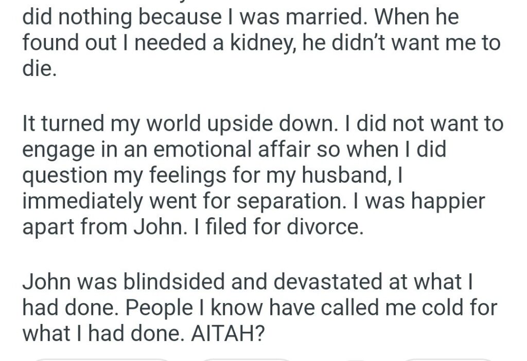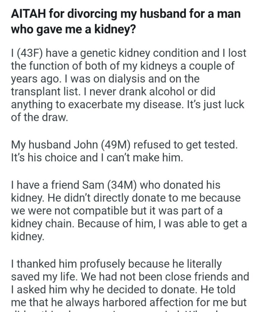 She handled this with more integrity than most people would. She did not start an affair. She realized that the contrast between these two men highlighted exactly what was missing in her marriage. She realized she was happier apart from the man who was content to watch her stay on dialysis. She separated from John immediately and filed for divorce.