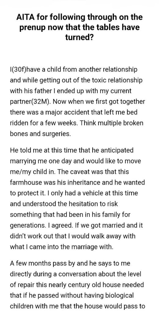 Her new guy, 32, stepped up. He told her he wanted to marry her one day and move her and her child into his farmhouse. How sweet, right? But this sweetness came with a side of legal paperwork. He explained that the farmhouse was his inheritance, and he wanted to “protect it.” The deal was that if they married and it didn’t work out, she would have to “walk away with what I came into the marriage with.” At the time, that was just a car. She understood and agreed.