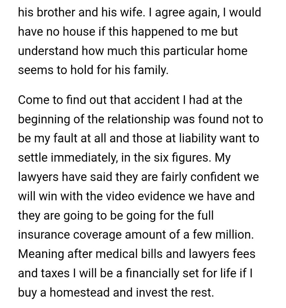 And then, plot twist. That accident she had? Turns out it wasn’t her fault. At all. And the at-fault party wants to settle immediately for six figures. Her lawyers, smelling blood in the water, are confident they can go for the full insurance coverage: a few million dollars. After all the bills are paid, she will be “financially set for life.”