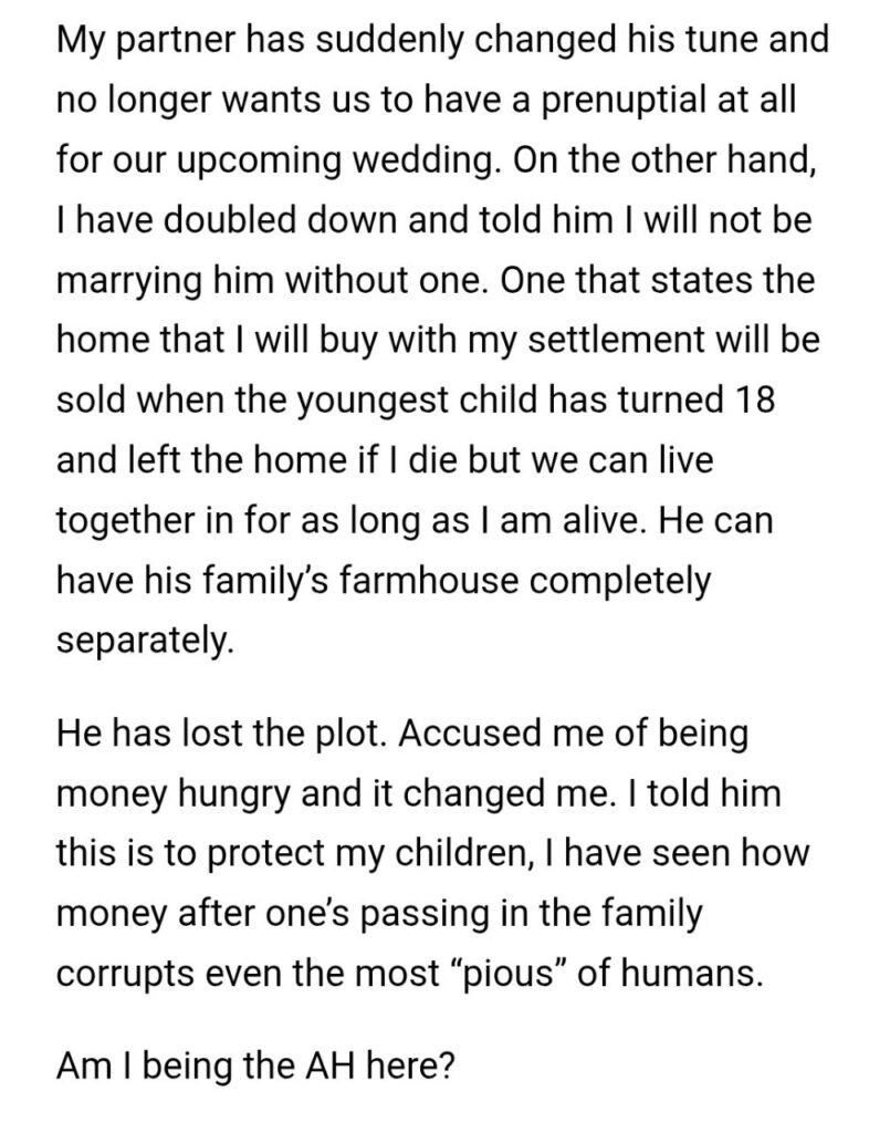 This is the part where you need to hold on to your hat, because the whiplash is real. Suddenly, with their wedding approaching, her partner has “changed his tune.” He no longer wants a prenup at all! What a romantic, right? He’s suddenly decided that their love doesn’t need such cold, heartless documents.