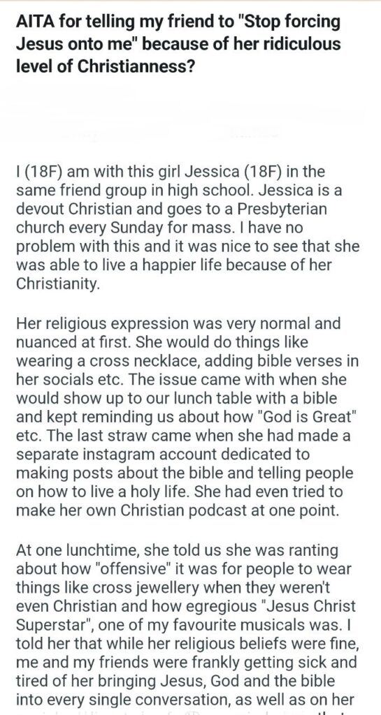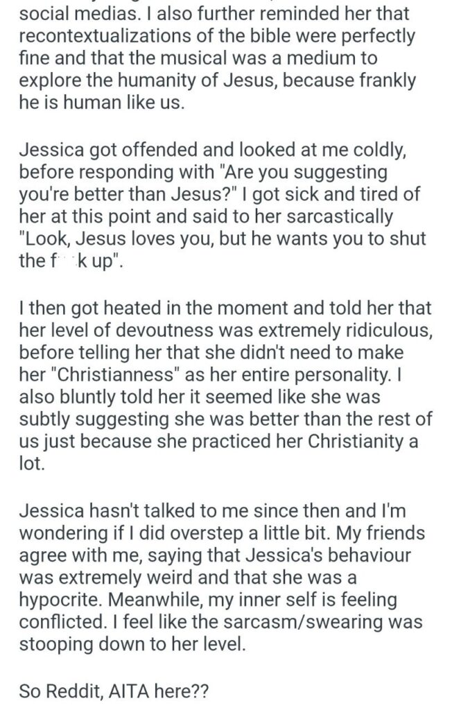 Our narrator, having reached her limit with the holier-than-thou commentary, tried to be reasonable. She told Jessica that while her beliefs are fine, the friend group was getting sick of her bringing Jesus into every single conversation. She also defended the musical as a valid artistic exploration.