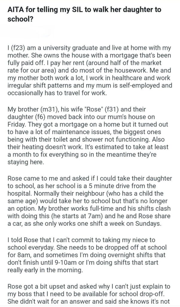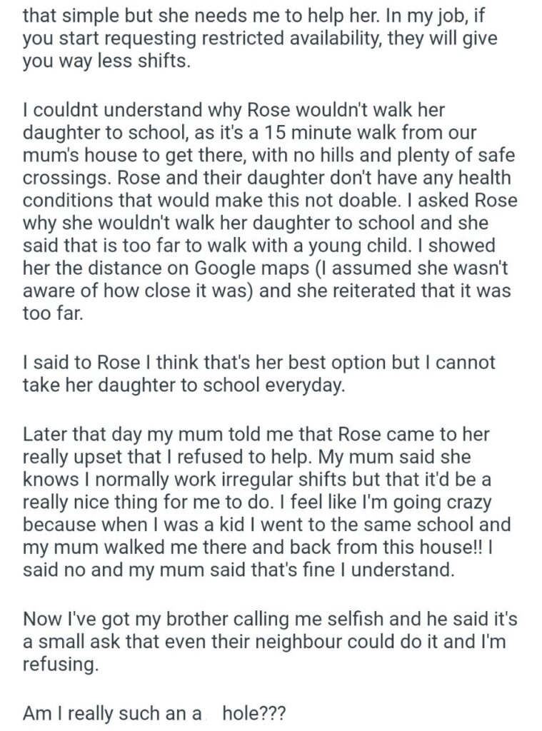 The narrator stood her ground, but now the family is piling on. The mom, who used to walk the narrator to that exact same school as a kid, is playing peacemaker and saying it would be a “nice thing” to do. And the brother is calling the narrator “selfish” because their old neighbor used to do it.