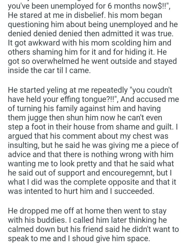 That would have been bad enough. But then he turned his attention to his wife. He stared at her chest while she was trying to eat and delivered a line so nasty it makes my skin crawl. He said, “Hey why don’t YOU get a boob job, you’re the one who needs it the most.” In front of his mother. In front of his cousin. While she is paying his rent.