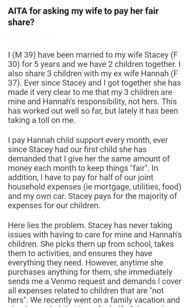 Our narrator is a 39-year-old guy married to “Stacey,” a 30-year-old woman who apparently thinks “yours, mine, and ours” applies to love, but absolutely not to wallets. He has three kids from a previous marriage and two kids with Stacey. From day one of their relationship, Stacey laid down the inflexible law: those first three kids are his problem, and his alone.