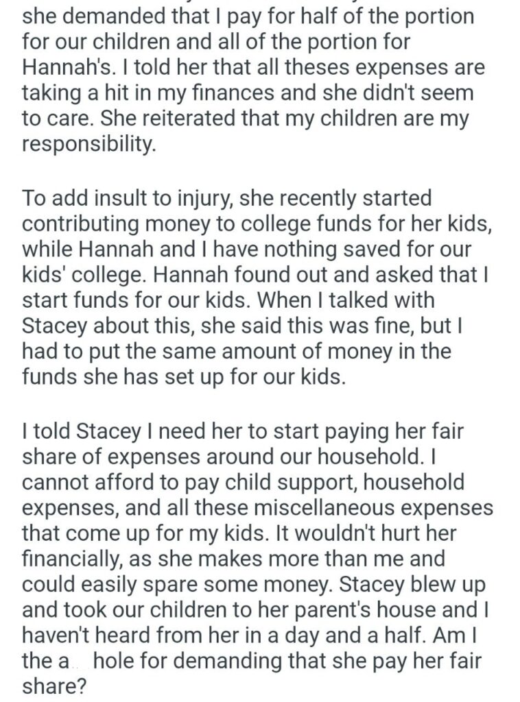 The final straw involved college funds. Stacey is saving for her two bio-kids. Great. When he wanted to start saving for his older three because his ex was asking, Stacey said sure, as long as you also match that exact amount into my kids’ accounts on top of what she’s already doing. So to save $100 for kid A, he has to find $200. He is broke. He finally snapped and told her he couldn’t keep doing this and needed her to contribute her actual “fair share” to the household since her arbitrary rules are bankrupting him.