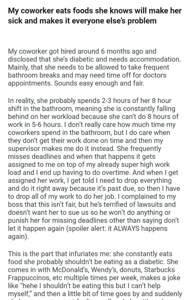 Our narrator has a coworker who was hired about six months ago. This coworker disclosed that she is diabetic and requires accommodations, specifically frequent bathroom breaks and time for doctor appointments. On paper, this is standard stuff. Anyone with a chronic illness knows the drill. You communicate your needs, and a good workplace supports you so you can do your job.