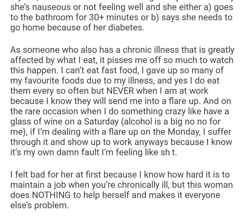 The narrator mentions that they also have a chronic illness affected by diet. They know the struggle. They have given up favorite foods. If they slip up, they suffer through the consequences at work because they know it is their own fault. Watching someone else treat their condition with such reckless disregard, while the narrator pays the price in overtime, is infuriating.