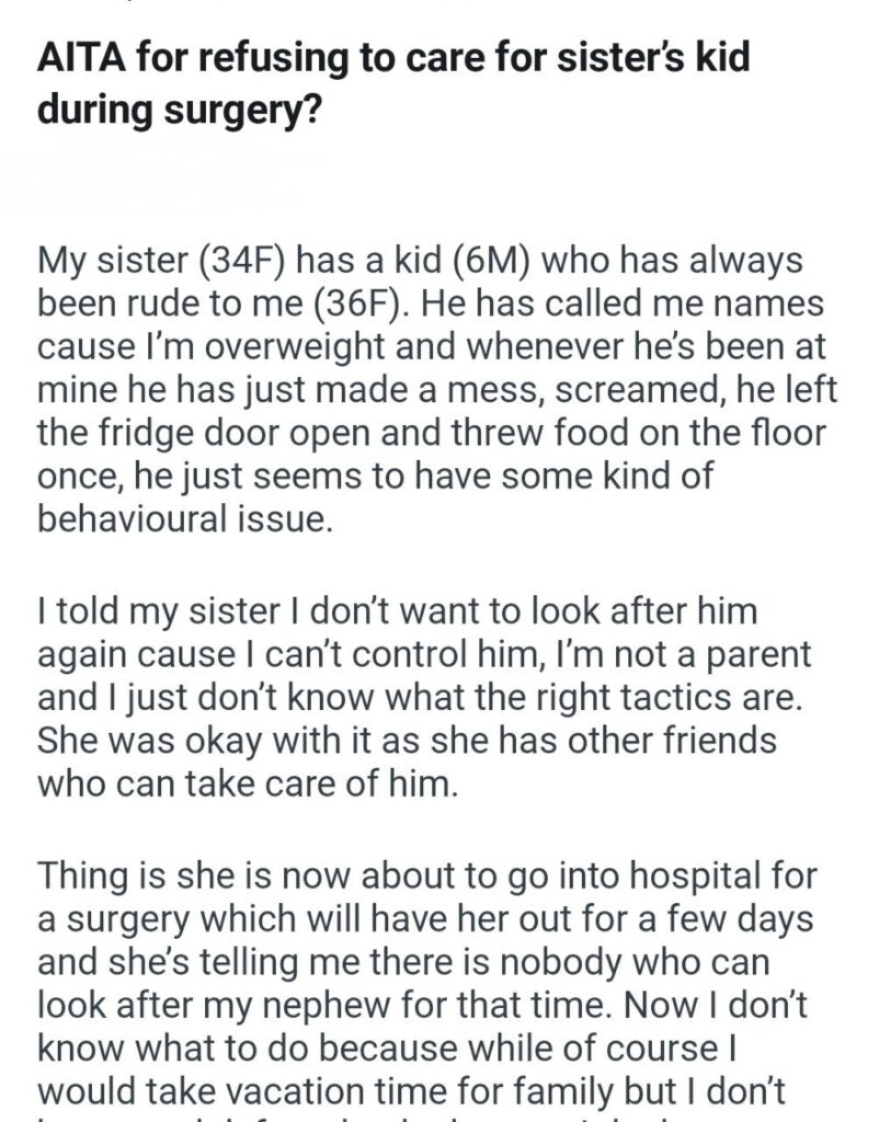 But then, life happened. The sister needs surgery. It is a serious situation that will have her out of commission for a few days. Suddenly, those “other friends” have evaporated into thin air, and the sister is back at the OP’s door, demanding she step up. The OP is now facing a choice: burn her limited vacation days to be verbally abused by a 6-year-old in her own home, or hold her ground.