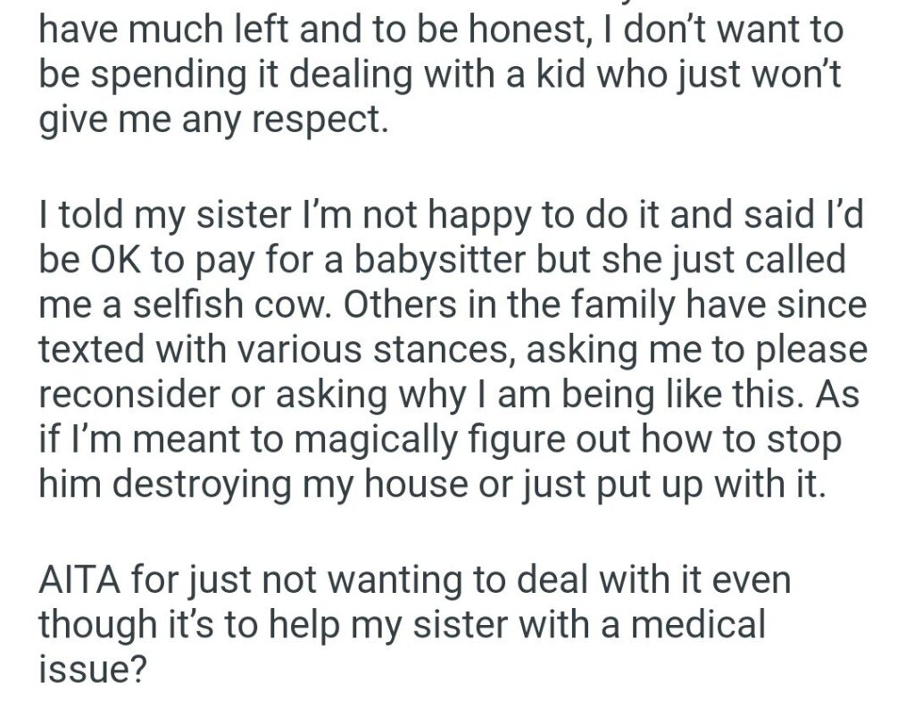 The OP stuck to her guns. She told her sister she wasn’t happy to do it. But—and this is the part that makes the sister’s reaction completely unhinged—she offered a solution. She offered to pay for a babysitter. She was willing to open her wallet to ensure her nephew was cared for by a professional who is actually equipped to deal with his behavior, just so she wouldn’t have to endure his abuse.